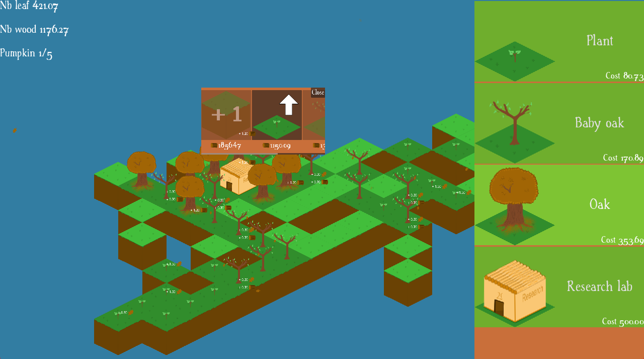 Additionally, it was unclear how the wood resource was to be used until I purchased a research lab and realized that the associated cost for the lab was in wood, not leaves. The game description on the itch.io page doesn't seem to mention this (I read it over a few times to be sure before commenting). It'd be useful to denote that it requires wood to purchase by putting a symbol by the listed price on the button (and a leaf symbol for the other items)